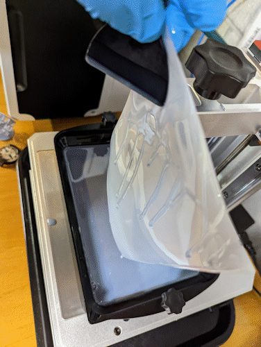 As an added bonus, I’ve successfully (about half of the time) been able to take the support left-overs stuck to the build plate and place it in the corner of the vat before manually exposing the bottom layer. This provided a nice handle to pull up on to lift the layer out of the vat without using a spatula.